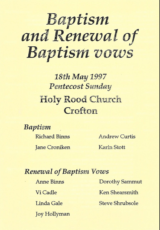 Many years previously I had been invited by a member of my tutor group- Caroline Berridge I am pretty sure it was- to attend her baptism by full immersion at Holy Rood Church. As she came out of the tank dripping wet in what appeared to be her pyjamas I thought to myself “She is very brave -there is no way you’d catch me doing anything like that – I would be much too embarrassed” Well as I explained in my Blog of April 13th I became a Christian on Feb 22nd 1997 and not long after I read in the church notice sheet that there was an opportunity for me to be baptised by full immersion. After a couple of quick enquires I discovered that you can’t be baptised twice. I thought “That’s a relief I have escaped” – you see I had already been baptised (Christened) as a baby. The trouble was shortly afterwards I found out that you can still re- affirm your infant baptism vows.