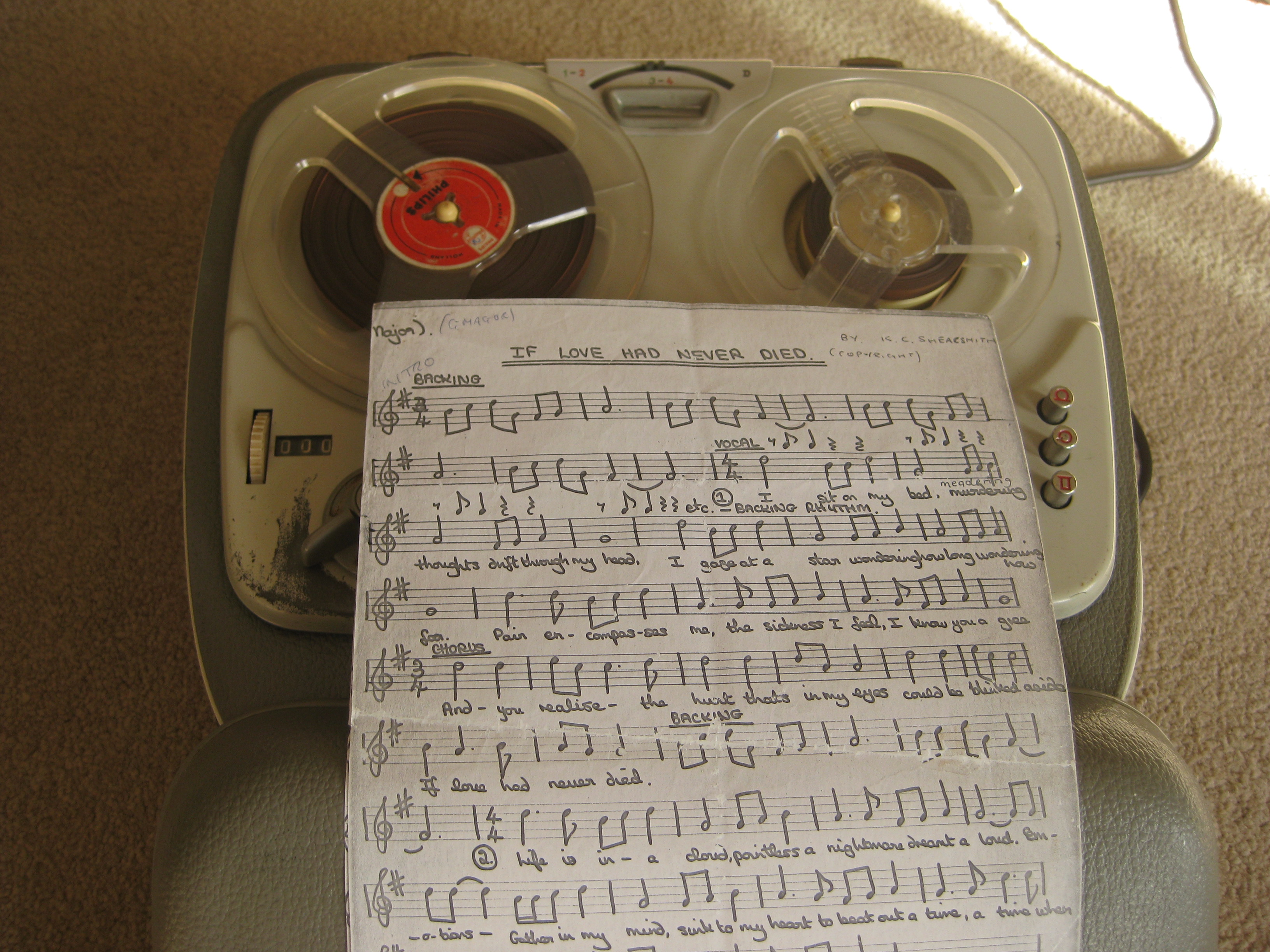 What to do? Well fortunately I discovered that my Grundig TK24 open reel tape recorder had a microphone. I also remembered a kind music student at King Alfred’s College (female) – so I put these two good pieces of fortune together and she (sorry if you are her and are reading this because I can’t remember your name) came up with written musical scores for about five songs. I know you all believe me but just in case you don’t I have braved the cobwebs of my loft to retrieve the original written score of “If Love Had Never Died” a pic of which is attached with the Grundig TK24.